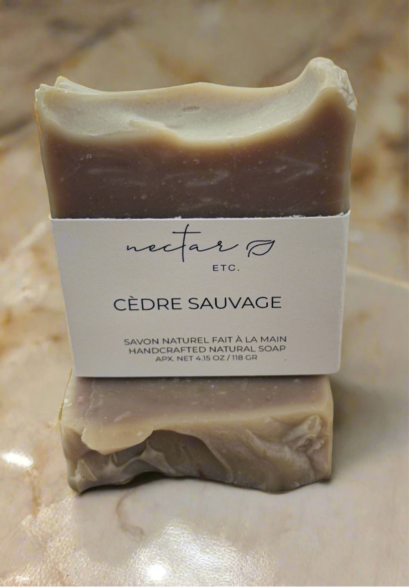Discover the rich, earthy aroma of Cèdre Sauvage, a handcrafted soap designed for deep cleansing and nourishment. Infused with a bold blend of cedarwood, patchouli, and wintergreen essential oils, it offers a rugged, masculine scent with warm, woodsy undertones and a refreshing hint of crisp mint.