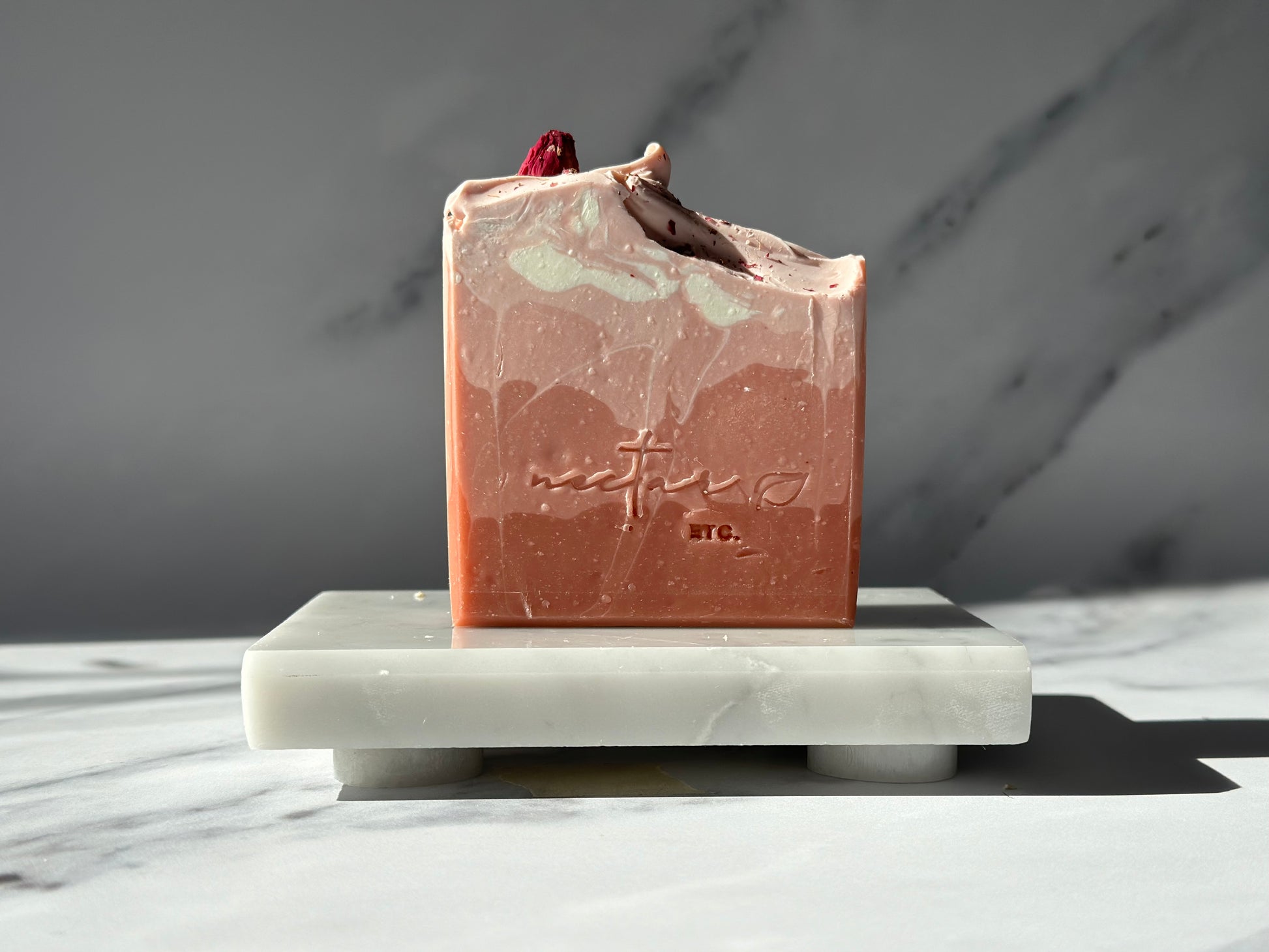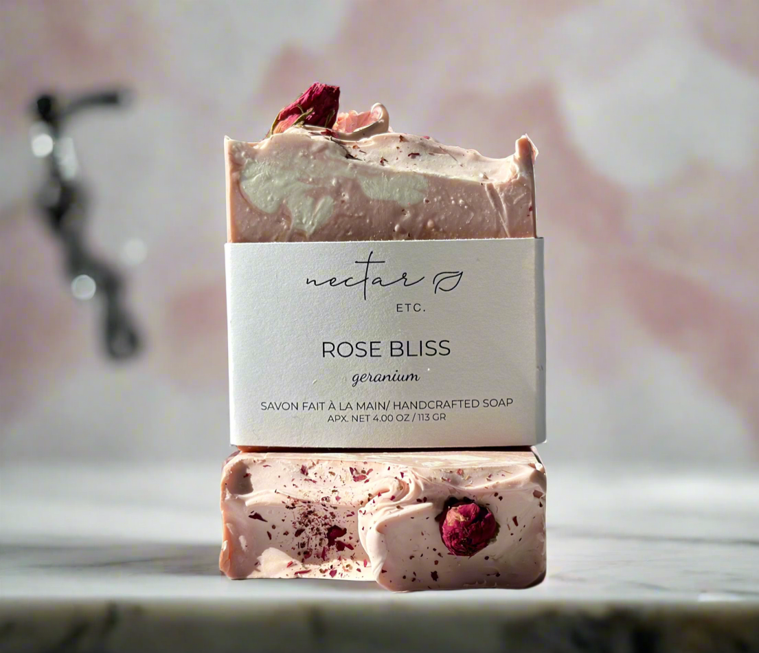 Rehaussez votre routine de soins avec Rose Bliss, un savon exquis disponible sur ma boutique Shopify. Fabriqué avec soin, ce savon associe les propriétés nourrissantes de l'huile d'olive, de l'huile de noix de coco, de l'huile d'avocat, du beurre de karité et de l'huile de ricin. Le mélange luxueux est rehaussé par l'arôme apaisant des huiles essentielles de géranium, de romarin et d'ylang-ylang. L'argile rose et le dioxyde de titane contribuent à un nettoyage doux, laissant votre peau rayonnante. Savourez la beauté naturelle des pétales de rose ornant ce savon. Plongez dans le bonheur des soins de la peau avec Rose Bliss.